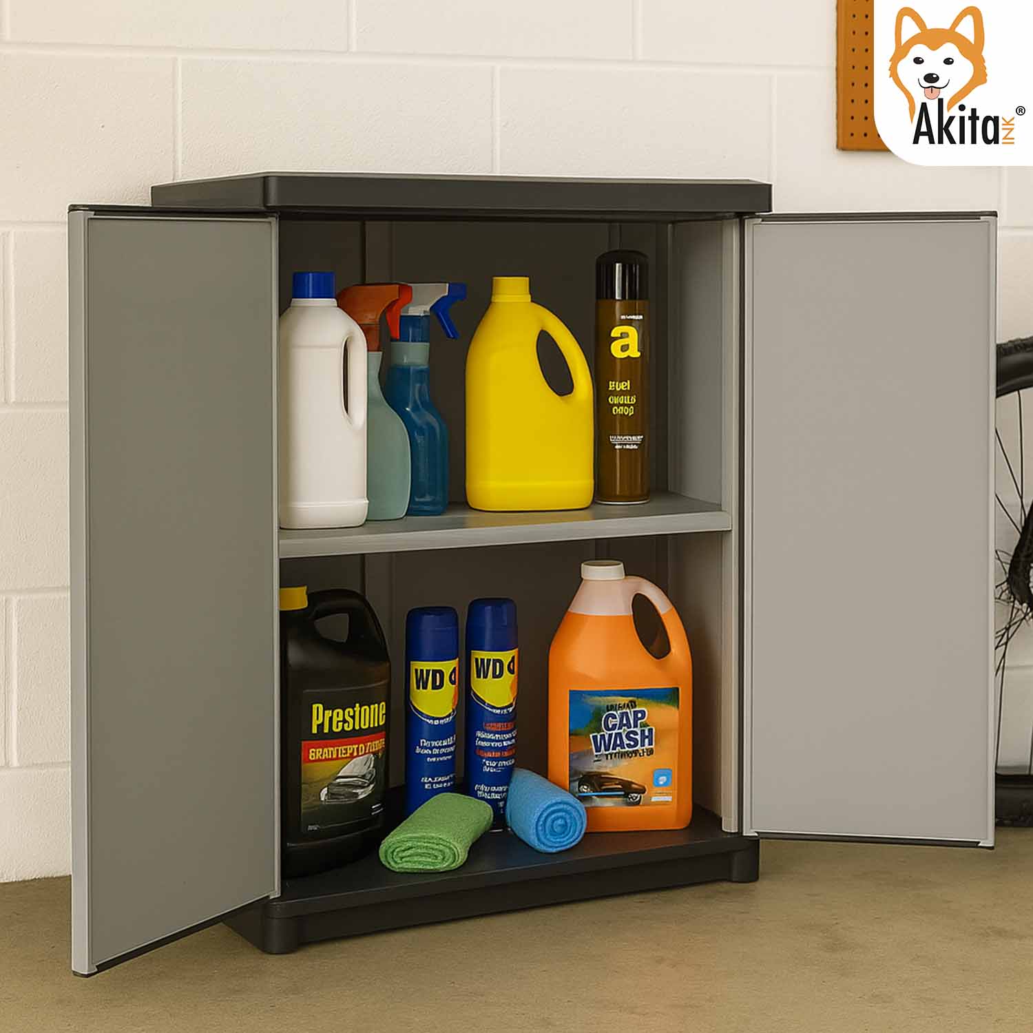Con dimensioni compatte di 68 x 39,5 x 85 cm, offre due ampi ripiani interni e due ante frontali, perfetti per organizzare utensili, prodotti per la pulizia, accessori da giardino o oggetti di uso quotidiano.