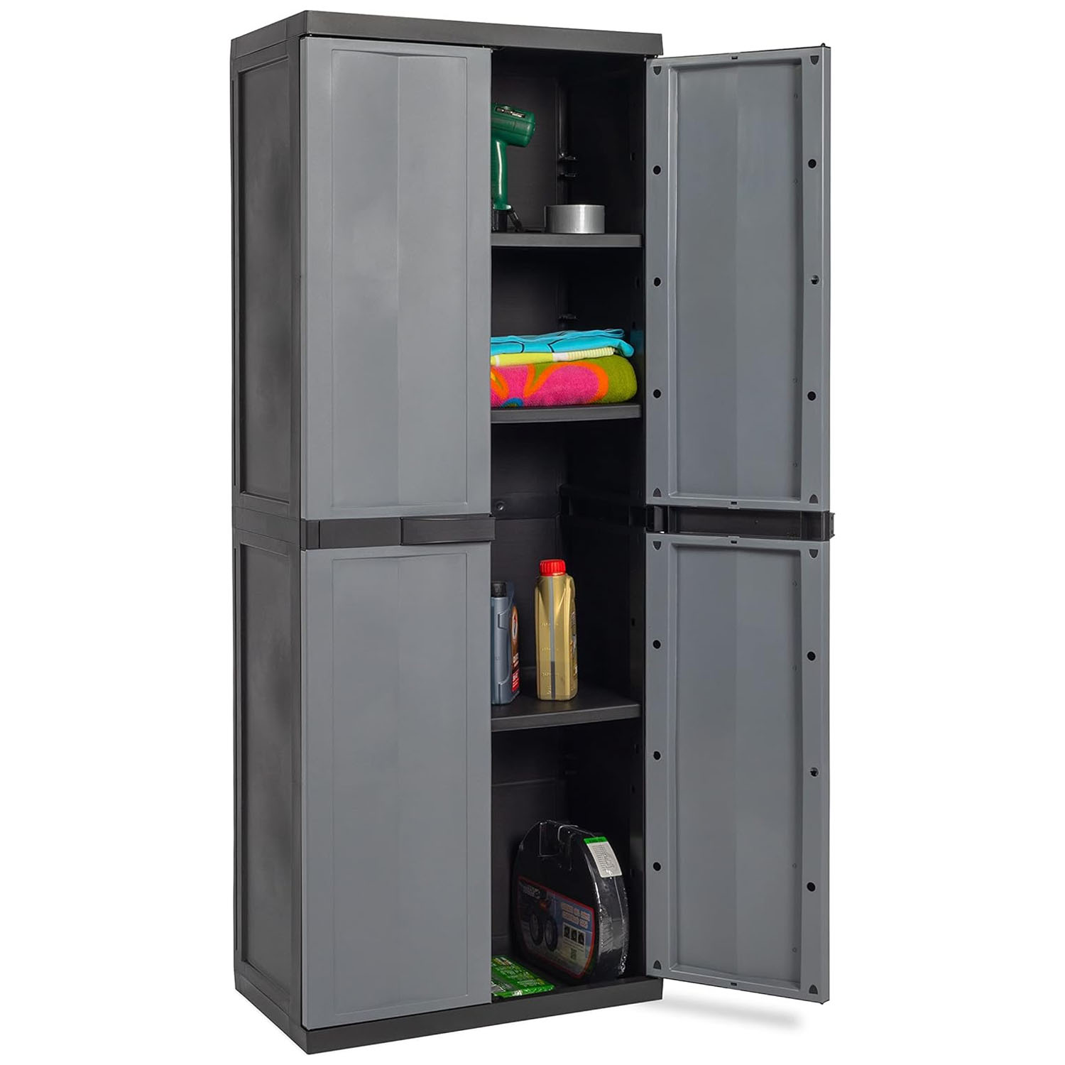 Realizzato in polipropilene riciclato e riciclabile, resistente ai raggi UV, è perfetto per uso interno (lavanderia, cantina, garage) o in spazi esterni protetti come balconi o terrazzi. Il modello è dotato di 3 ripiani regolabili in altezza con una portata di 15 kg ciascuno (se distribuiti uniformemente), e uno scomparto verticale per scope o oggetti ingombranti.