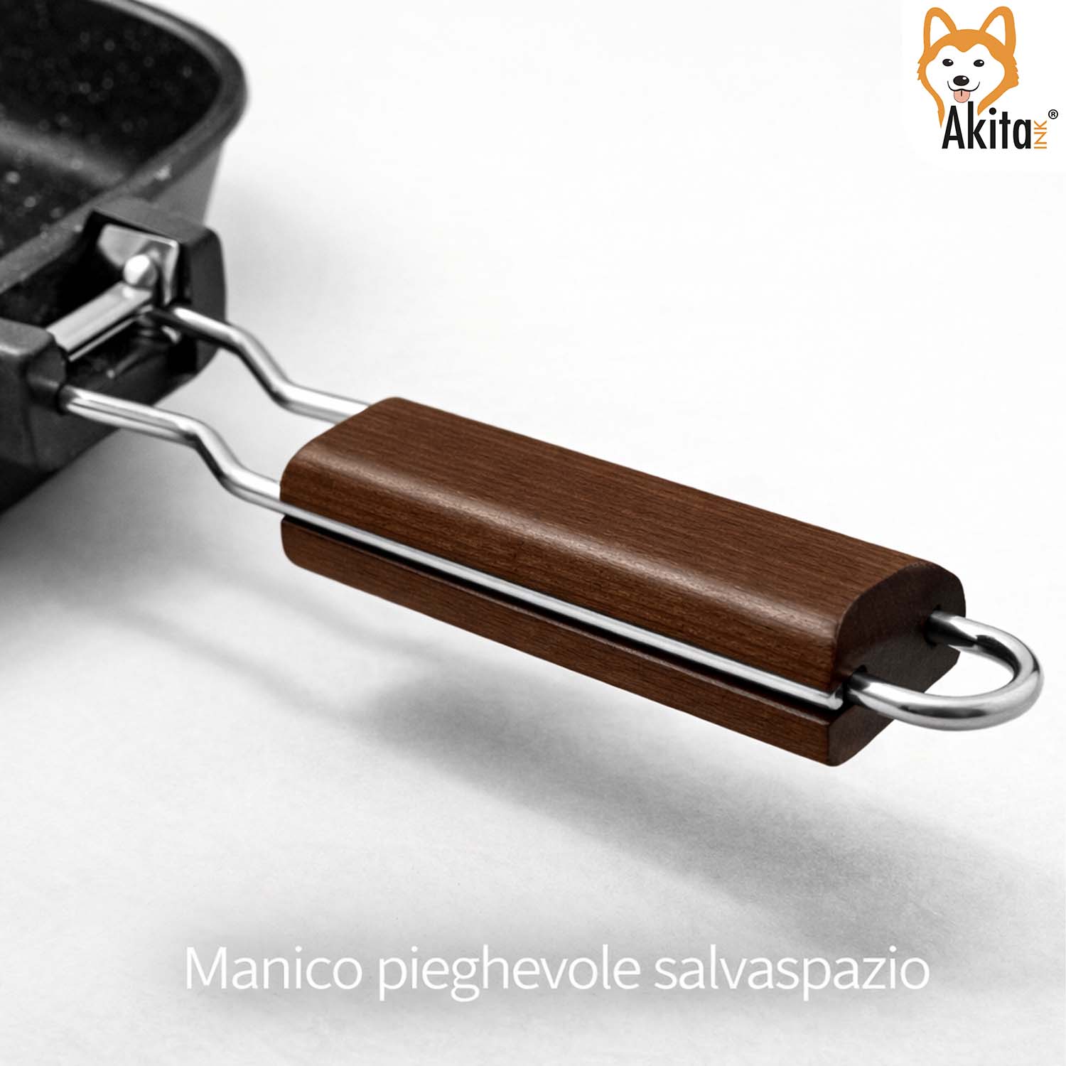 Il manico pieghevole rende la bistecchiera pratica e salvaspazio, facilitando sia l’utilizzo che la conservazione. Compatibile con piani a induzione, oltre che con altre fonti di calore, è una soluzione versatile e resistente per l’uso quotidiano in cucina.