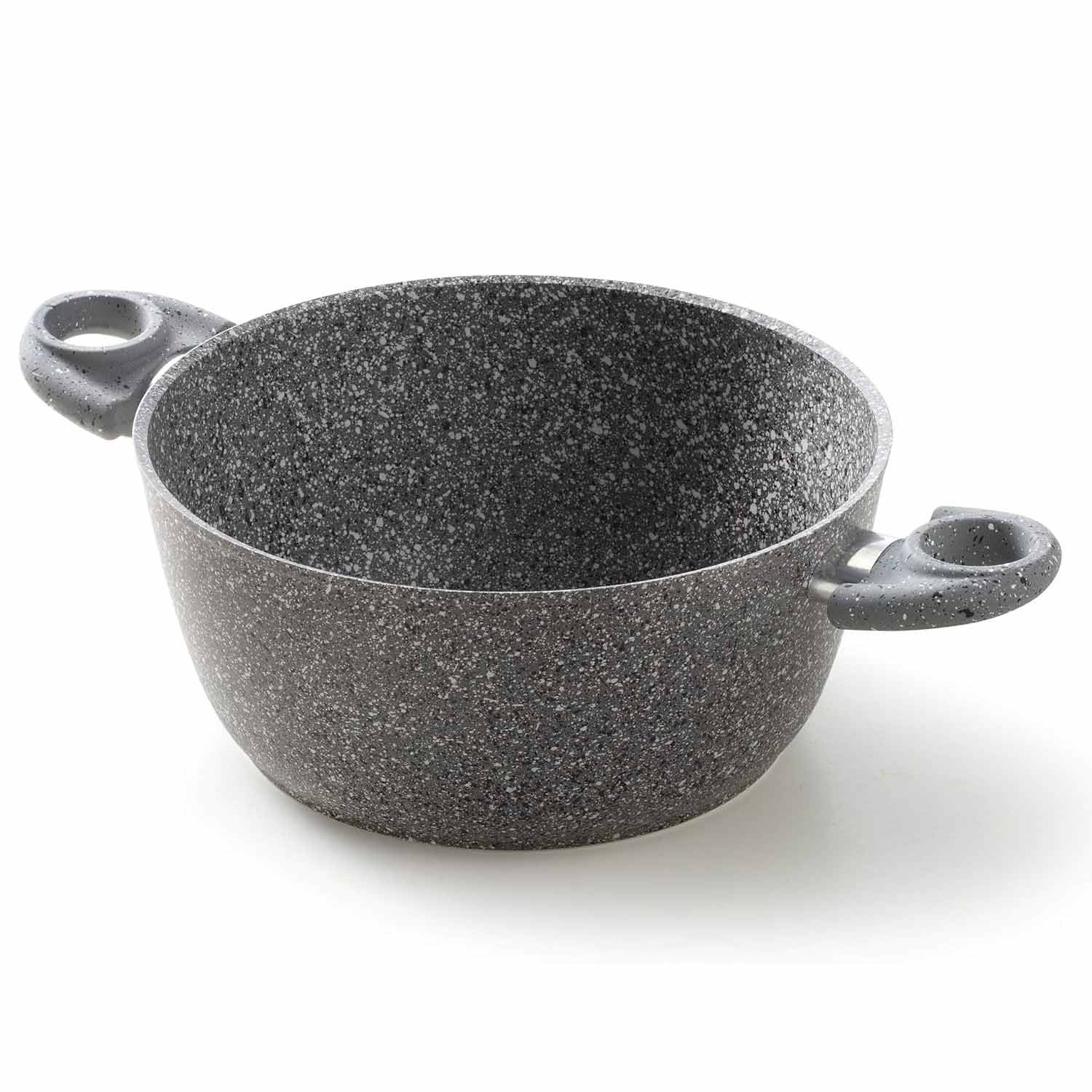 Il fondo microrettificato antiscivolo assicura una distribuzione uniforme del calore su tutte le fonti di calore, ottimizzando la resa dei cibi. I manici in bakelite sono ergonomici, resistenti al calore e rivestiti con un soft touch effetto pietra, che assicura una presa comoda e sicura anche durante le cotture più intense.