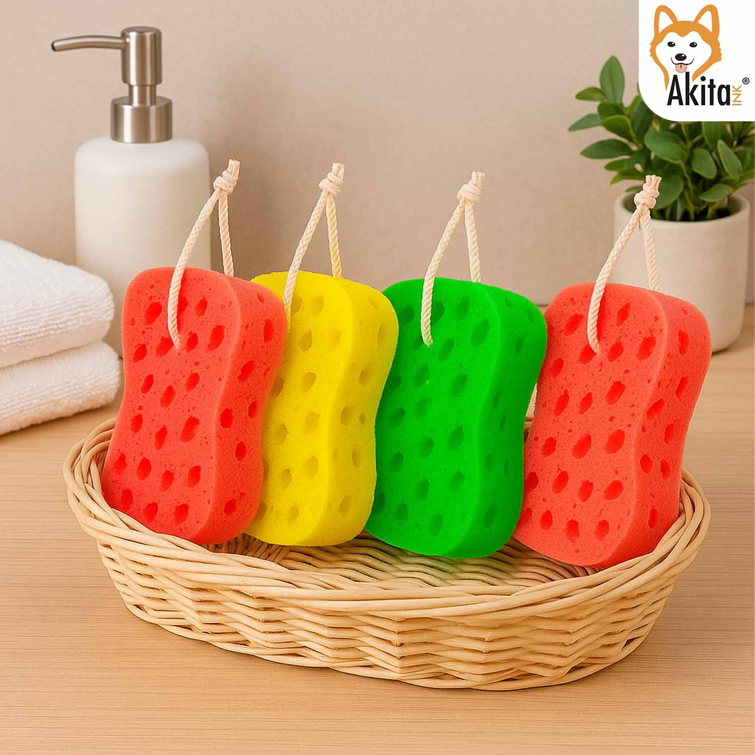 Set 4 Spugne da Bagno Colorate con Cordino – Design Forato per un’Asciugatura Rapida