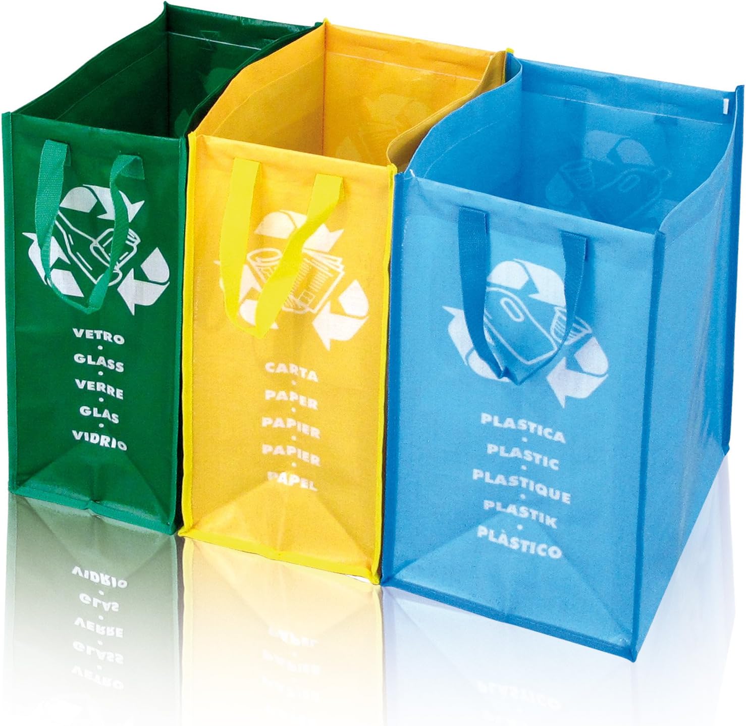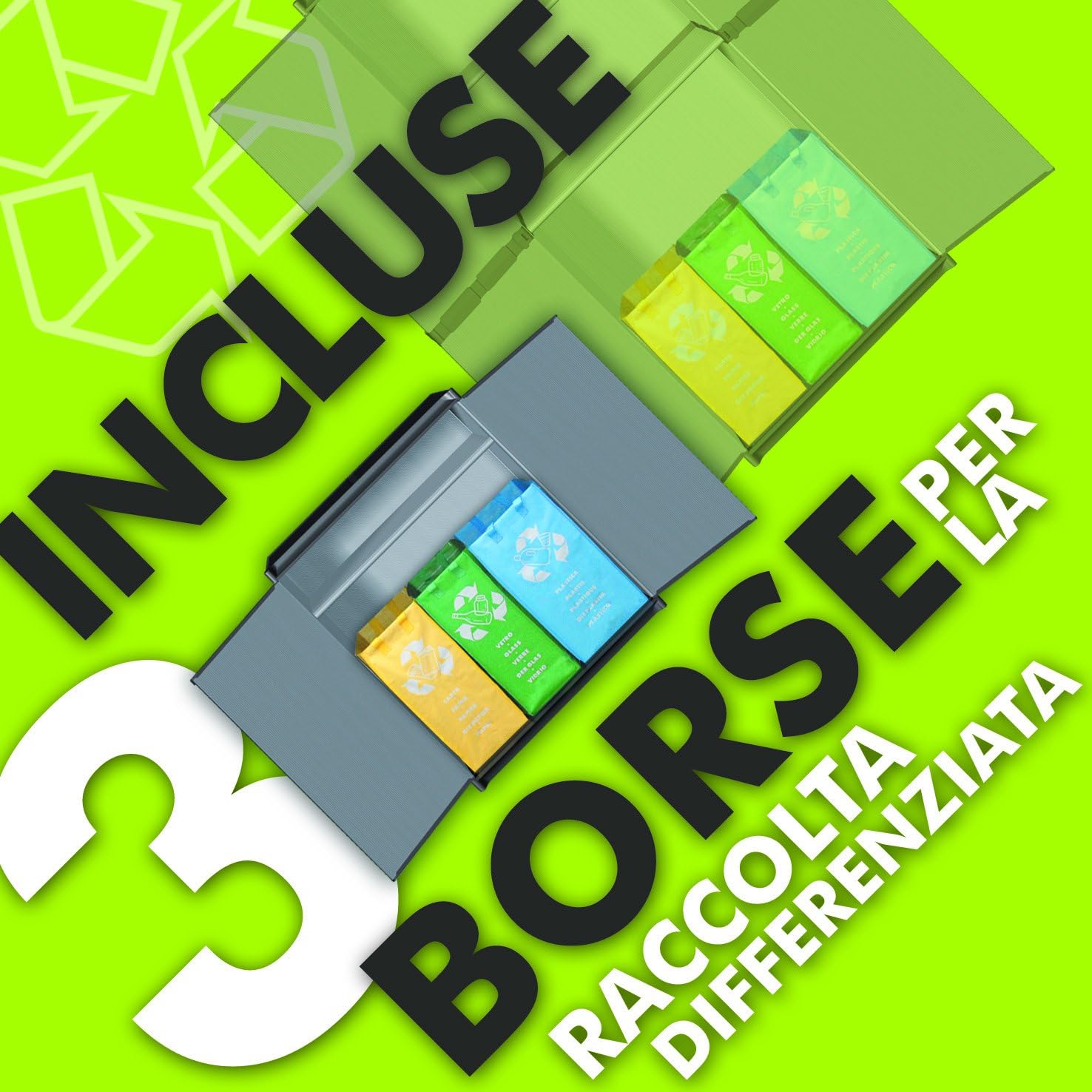 I ripiani ed i pannelli sono in resina di PVC; base, copertura superiore, copertura posteriore, montanti, maniglie e borse per la raccolta differenziata in resina di PP. Tutti i materiali usati per la realizzazione di questo prodotto sono di seconda vita certificati.