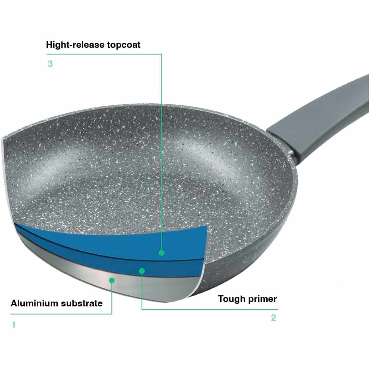 Realizzata in alluminio forgiato effetto pietra, unisce robustezza e distribuzione uniforme del calore, consentendo di cucinare in modo sano e senza grassi.