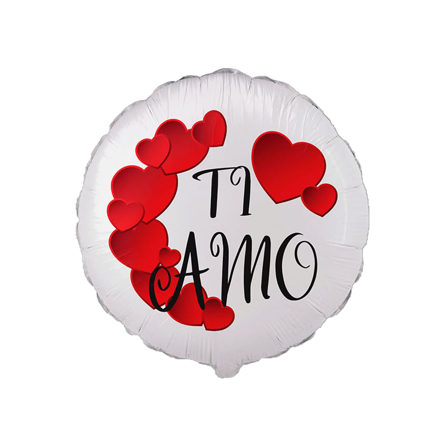 Dichiara il tuo amore in modo dolce e originale con il palloncino tondo bianco “Ti Amo” decorato con cuori rossi.