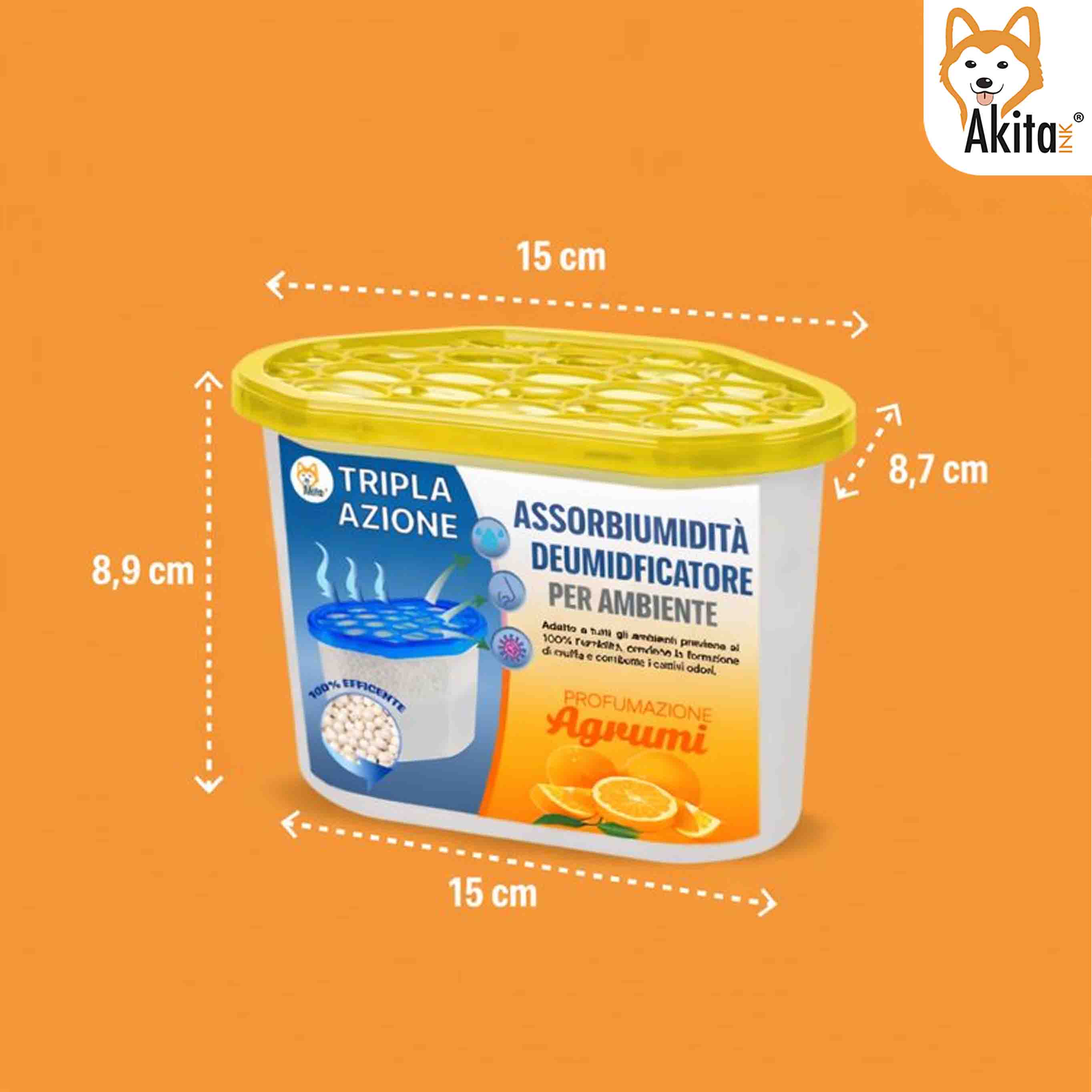 Il Set 6 AssorbiUmidità AkitaInk da 500 ml – Profumazione Agrumi è la soluzione ideale per ridurre l’umidità in eccesso e neutralizzare i cattivi odori, diffondendo al contempo una fragranza fresca e rivitalizzante.