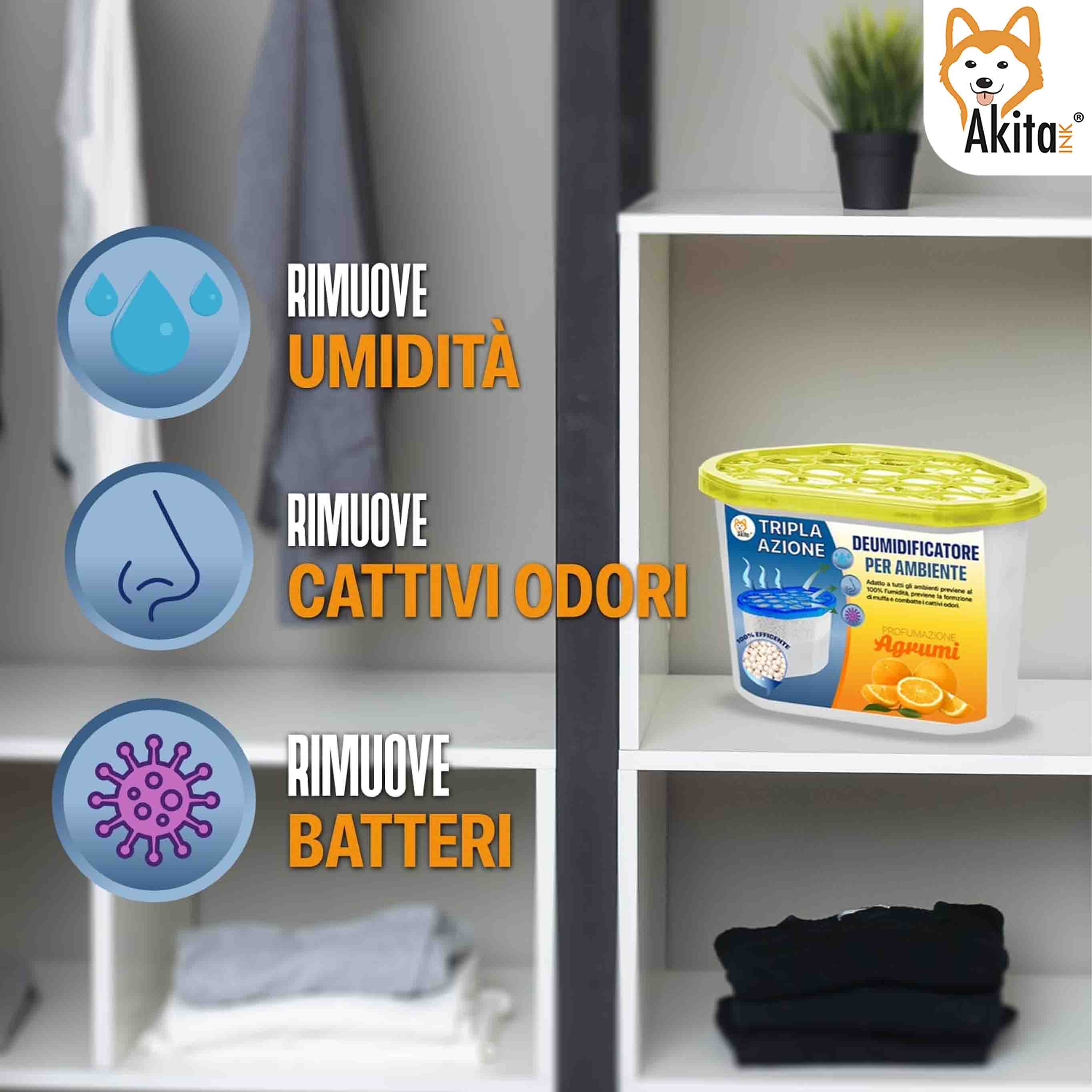 Perfetti per armadi, scarpiere, bagni, cucine, dispense, box, camper e ambienti umidi, i deumidificatori AkitaInk sono semplici da usare, non richiedono elettricità e risultano riutilizzabili grazie alle ricariche compatibili.