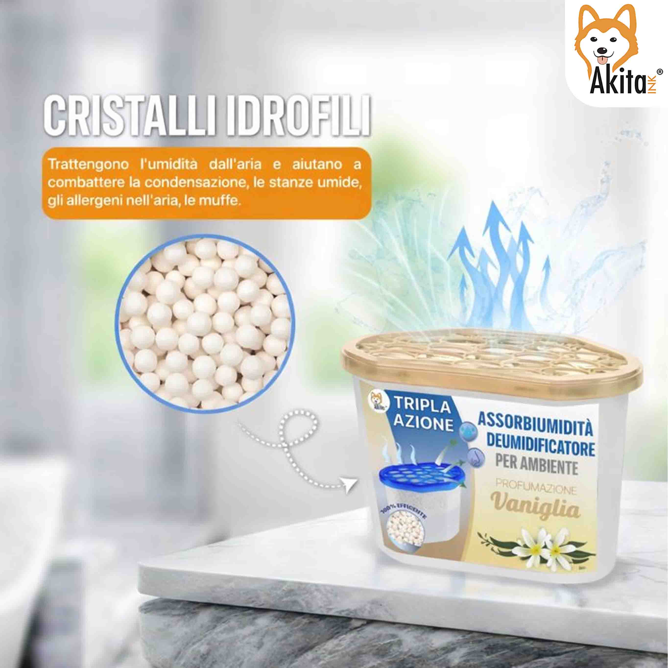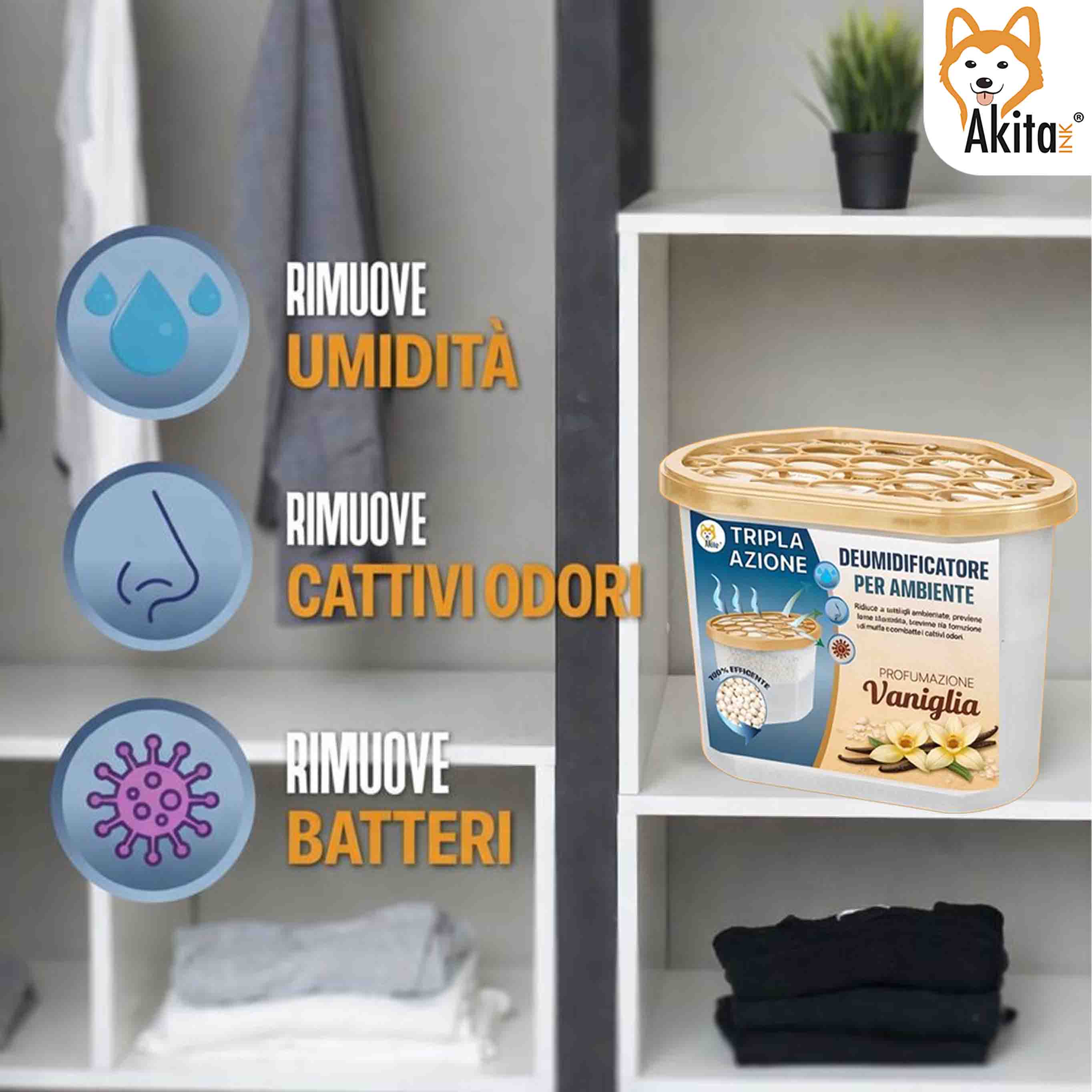 Il Set 6 AssorbiUmidità AkitaInk da 500 ml – Profumazione Vaniglia è la soluzione ideale per ridurre l’umidità in eccesso e contrastare i cattivi odori, diffondendo una fragranza dolce, calda e avvolgente che rende gli ambienti più confortevoli e accoglienti.