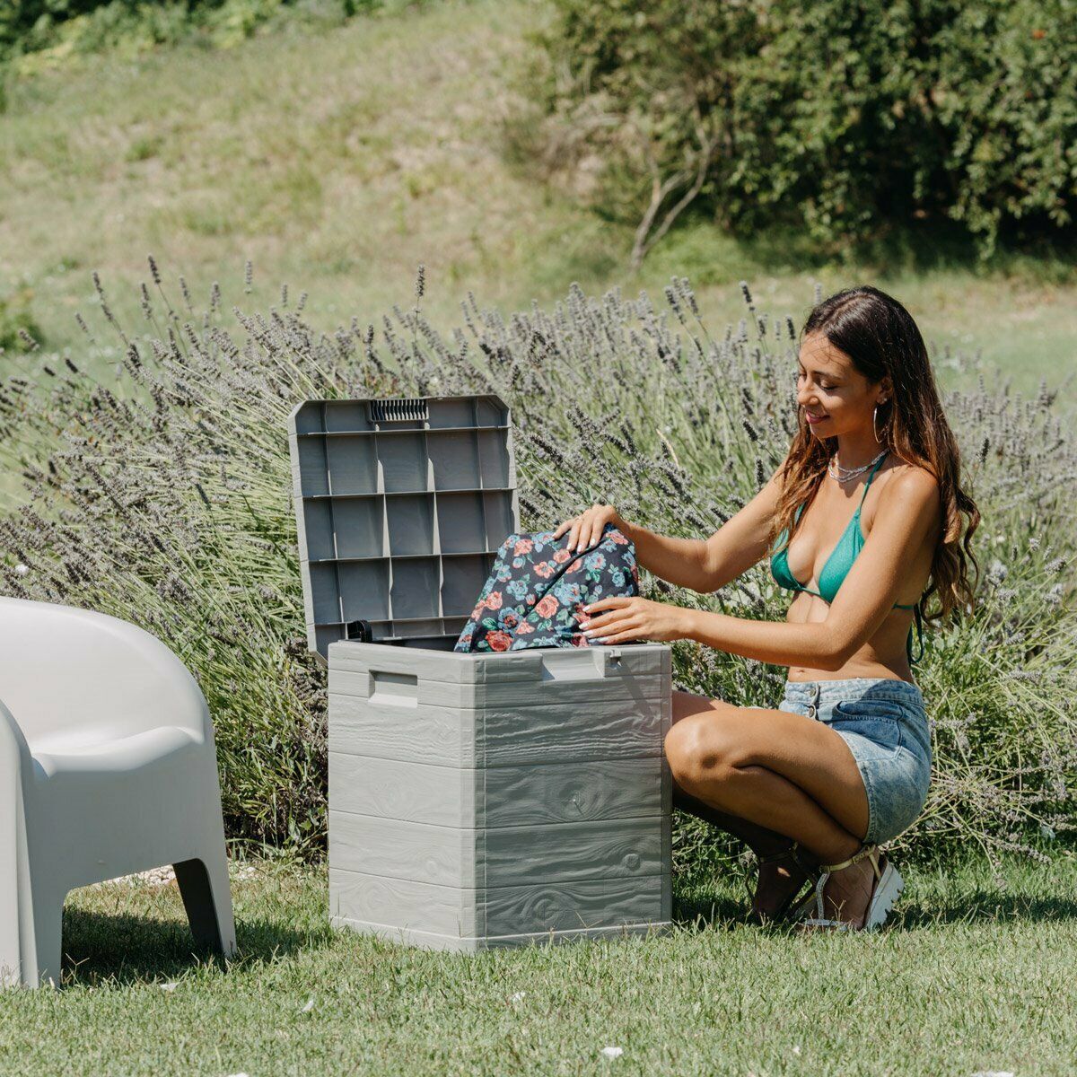 Con una capacità di 90 litri, è ideale come contenitore portattrezzi, porta coperte o cuscini, proteggendo il contenuto da polvere, umidità e agenti atmosferici. Grazie alla struttura resistente ai raggi UV e alle intemperie, mantiene nel tempo colore e solidità.